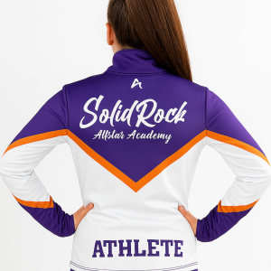 Elevate your team look with the official Solid Rock AllStar Academy Sublimated Jacket—where performance meets personalization. Designed for both style and function, this vibrant jacket features a bold purple, white, and orange color palette that represents your all-star spirit with pride.